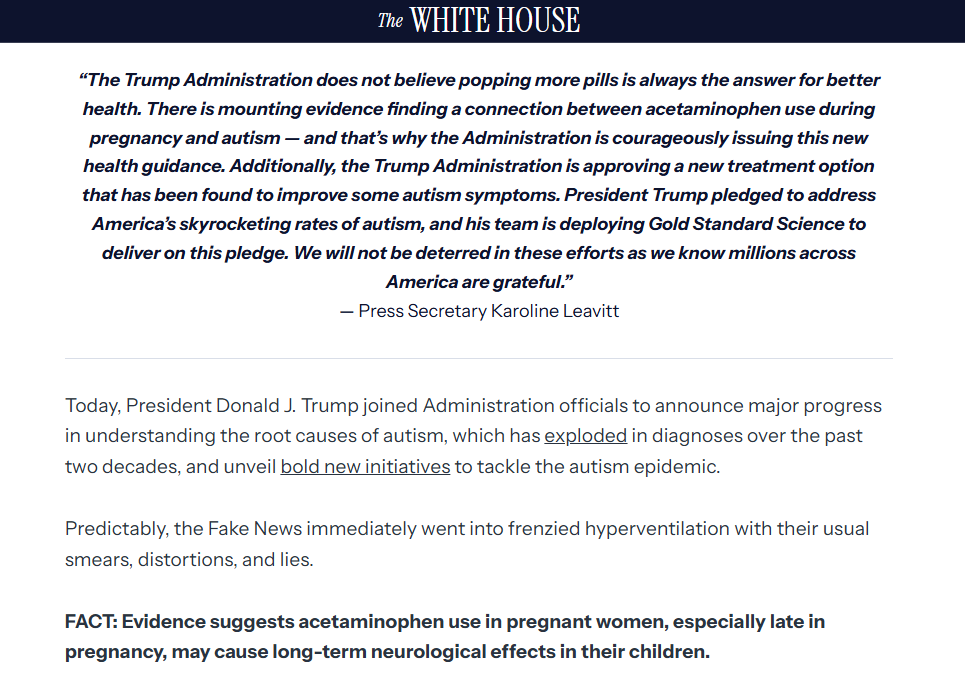 During his press conference Trump reasoned that “the meteoric rise in autism is among the most alarming public health events in history.” Additionally, the official White House press release seemed to preempt the backlash by prefacing its advice with, “Predictably, the Fake News immediately went into frenzied hyperventilation with their usual smears, distortions, and lies.”
